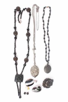 including two jet bead pendant necklaces, a white metal pendant locket, a banded agate pendant, a green and white metal pendant and an earring
