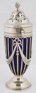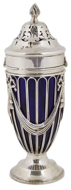 the wrythen finial on a pierced domed twist cover, the pierced body with swags of garlands upon a circular foot ring, with blue glass liner, hallmarked J B Chatterley & Sons Ltd