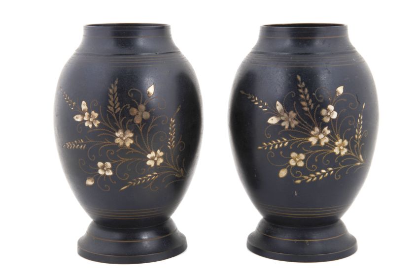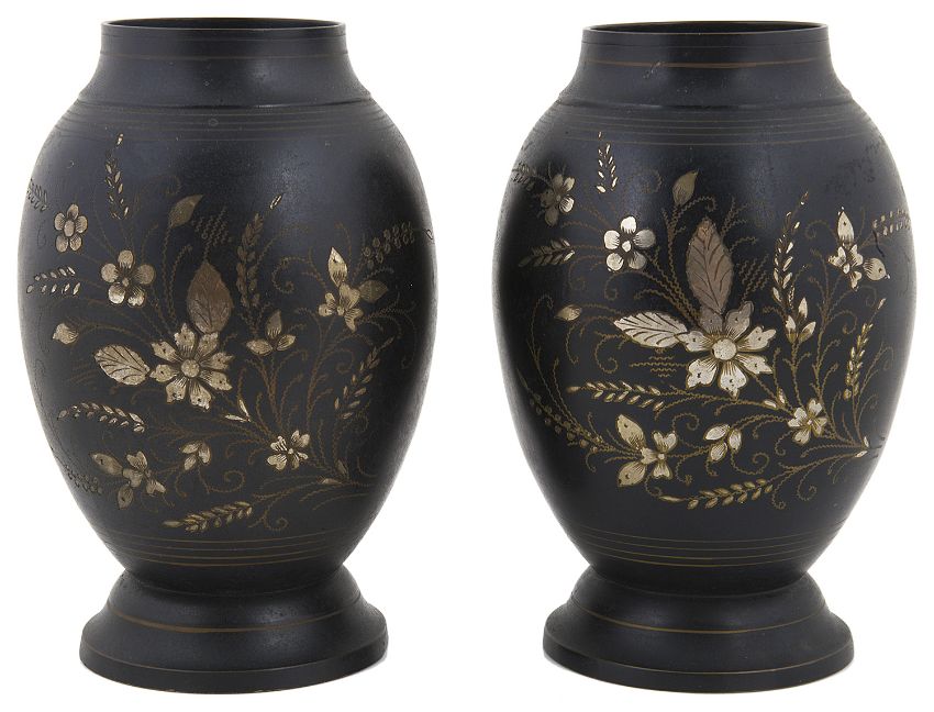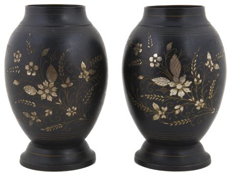 of baluster black form with two panels of silvered floral sprays, raised upon circular foot ring, impressed mark to base, Sew India 99 Bidri, (2)
