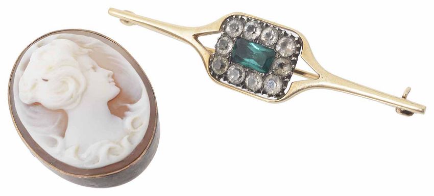 the cameo set in yellow metal mount, tests for 9ct, marks rubbed, together with a Georgian paste brooch set in later 9ct gold brooch mount (2)
