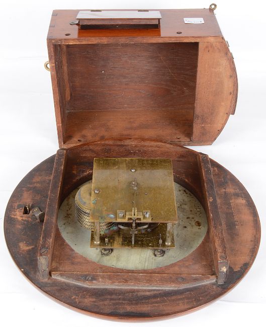 Condition: Dial slightly worn, movement complete but in need of a clean, pendulum suspension broken, lacking two plugs. With winder but no case key.