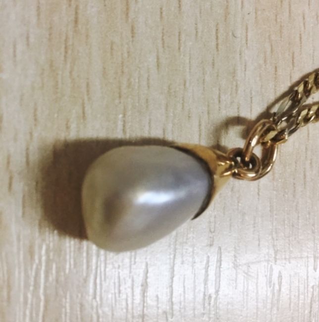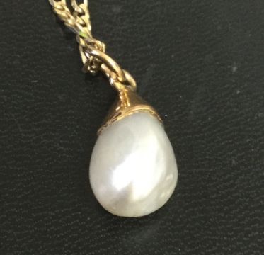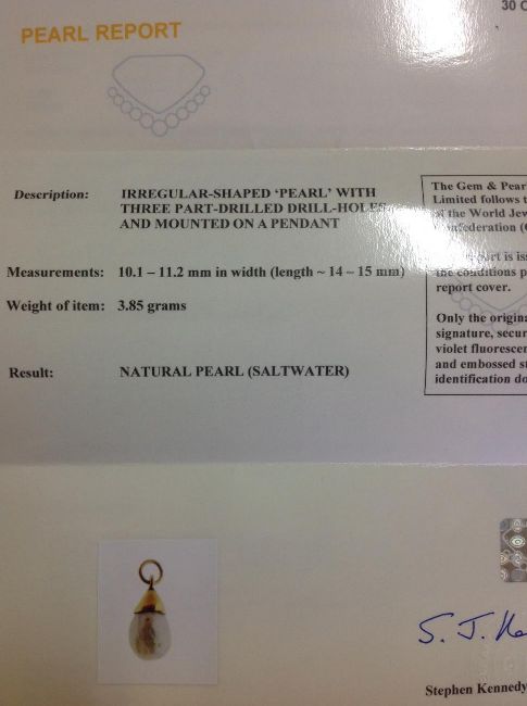the natural saltwater pearl of three sided drop form and with simple yellow metal pendant fitting, tests for gold, suspended from a later 18ct gold figaro link neck chain, with laboratory certificate stating the pearl is a natural saltwater pearl