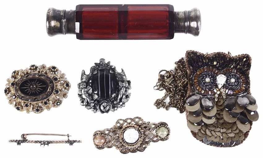 Condition: The bottle missing glass stopper but generally tops to bottle close flush and well. The glass with minor chip. Brooches in fair condition.