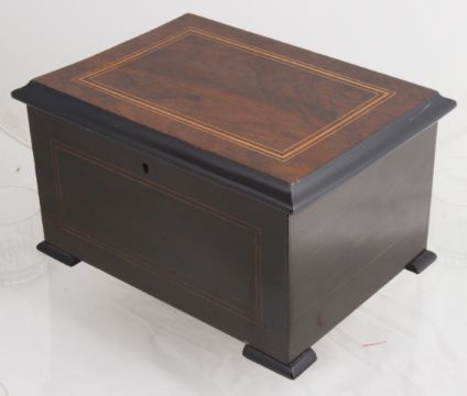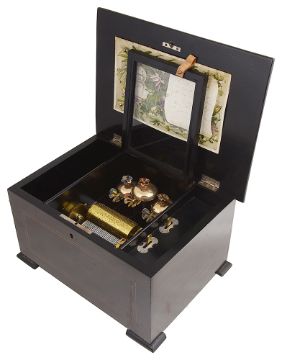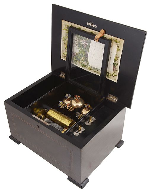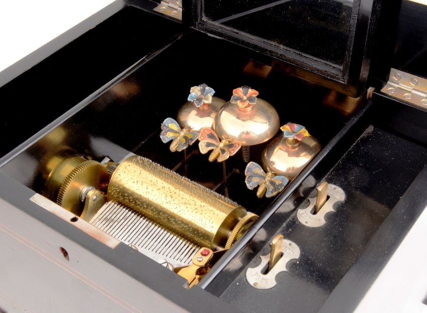 the 9cm cylinder playing six airs as listed on the tune sheet, accompanied by three saucer bells with enamelled butterfly strikers and enamelled flowers, with start/stop lever, and change/repeat lever, contained within a rosewood veneered case