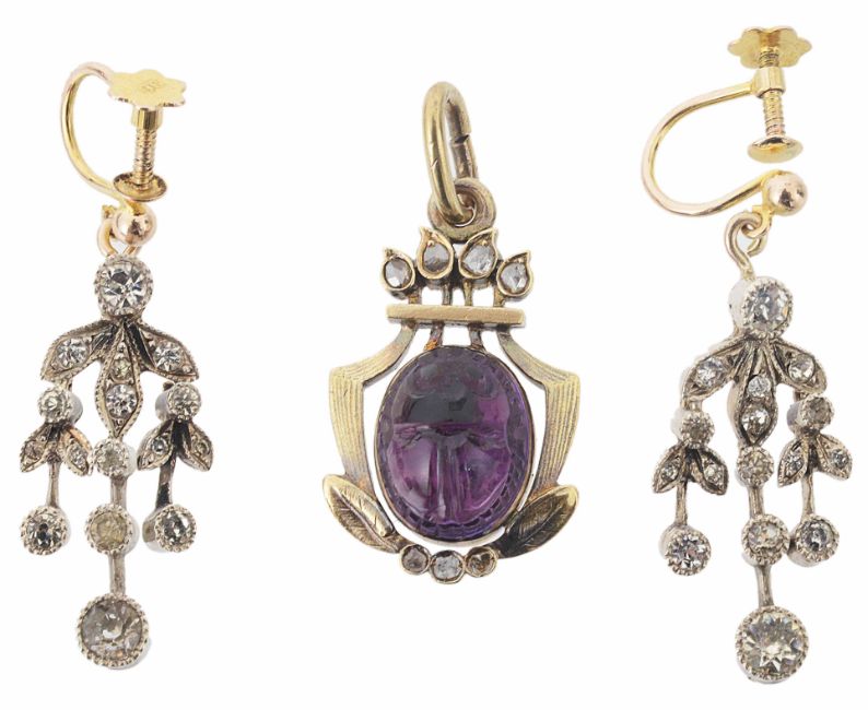 the scarab set within a stylised foliate mount and with rose diamond detail above and below, yellow metal mount tests for gold, together with a pair of Edwardian silver and paste drop earrings, later 9ct yellow gold fittings, associated leather box (2)