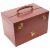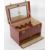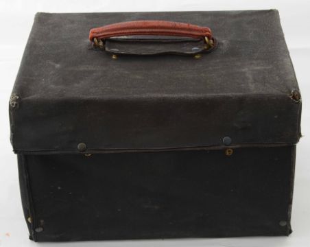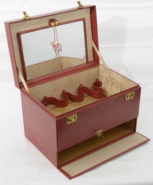 with lined interior, internal removable mirror and adjustable strap fittings for bottles, lower hinged drop down compartment.