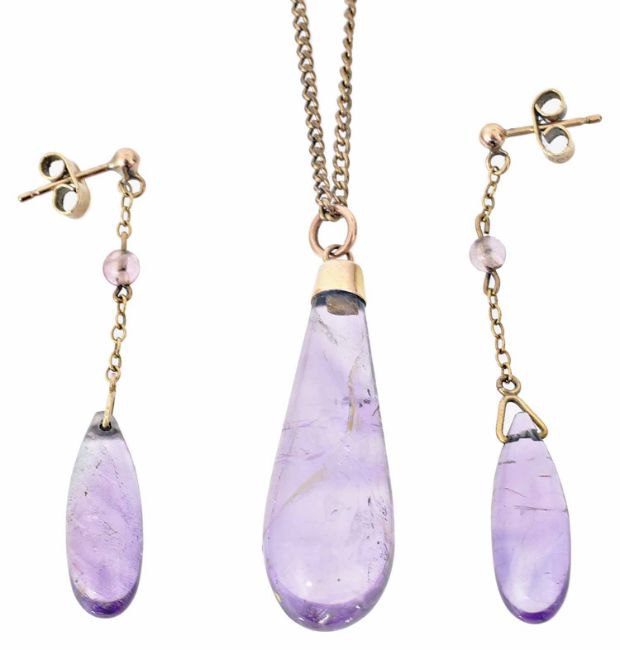 the pendant of simple polished tear drop form with yellow metal fitting and suspended from a yellow metal chain, both test for gold, together with similar drop earrings, fittings test for gold (2)