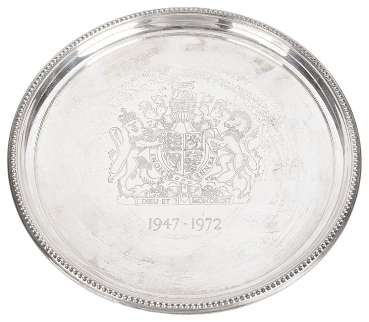 of circular form with beaded edge, the centre engraved with coat of arms and 1947-1972, by Historical Heirlooms Ltd