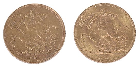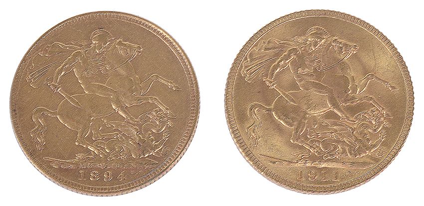 jubilee head of Queen Victoria facing left, with St George slaying the dragon reverse, together with a George V 1911 gold full sovereign, George V facing left with St George slaying the dragon reverse, (2)
