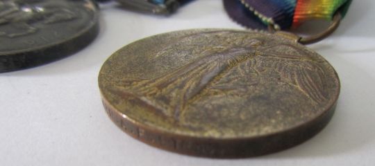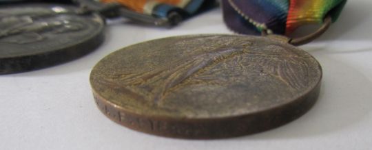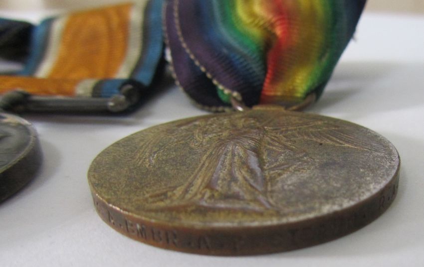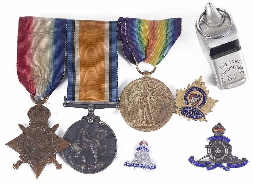 comprising 1914-15 Star; British War Medal 1914-18; Allied Victory Medal 1914-19; together with a silver Royal Artillery cap badge; British Columbia Regiment cap badge 158; The Acme Thunderer L.N.E.R. whistle and another Royal Artillery replica cap badge, (7)