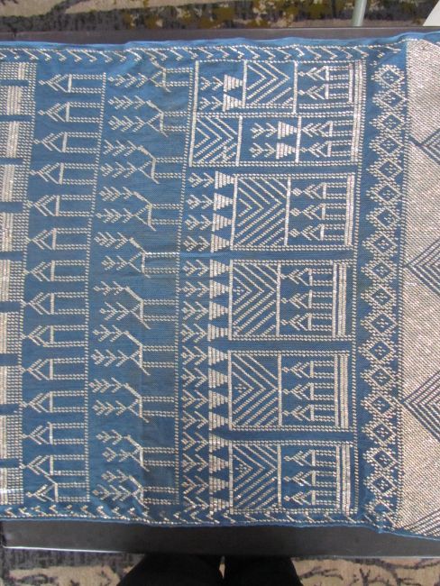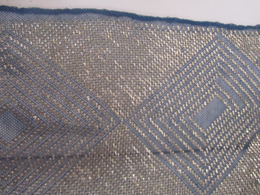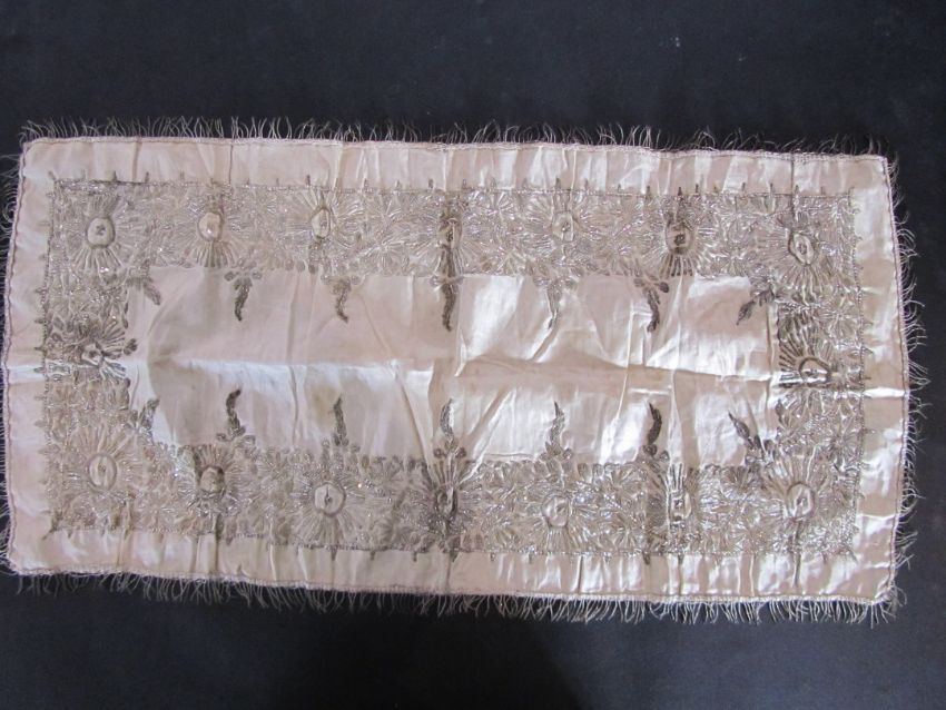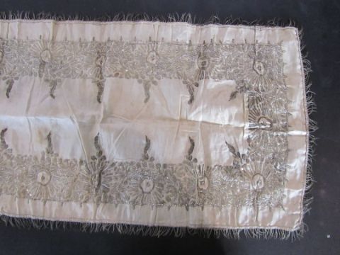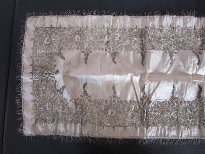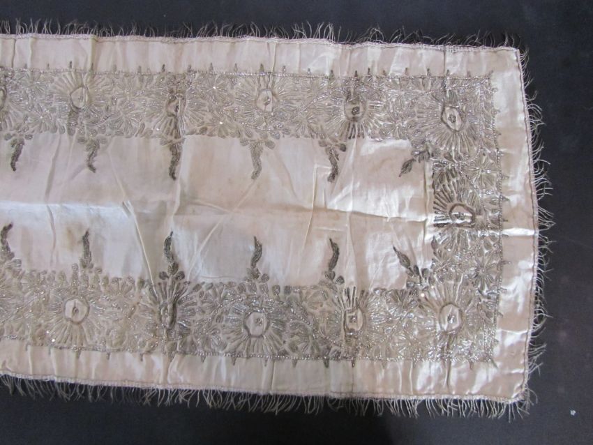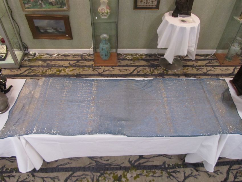 An early 20th century Assuit Egyptian worked silver metal shawl, circa 1920the blue ground worked with silver stylised geometric figures and designs, with diamond shaped motifs to either end; together with a Turkish silver couched and sequinned cream satin cloth, (2)1st: 226 x 72.5cm; 2nd: 81.5 x 42cm approximately.Condition: Fair to good, with wear and staining on the second example; there are rust stains on the cream example front and back; the blue example has slight fraying at the ends and minor silvered metal missing at the ends, sides slightly out of shape at the sides.