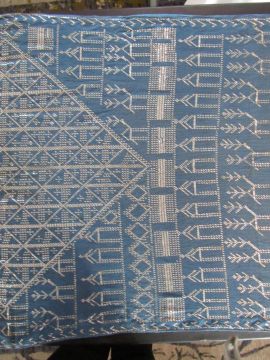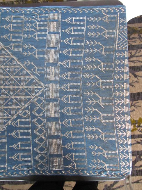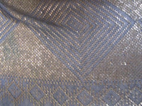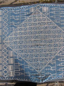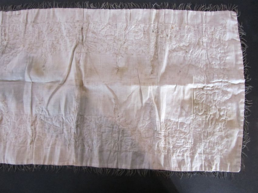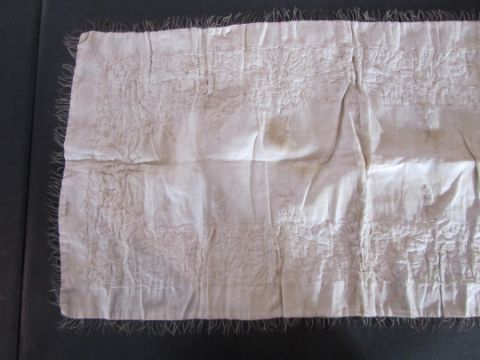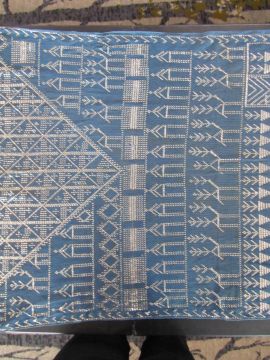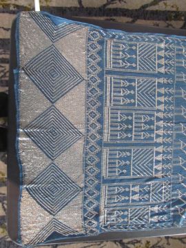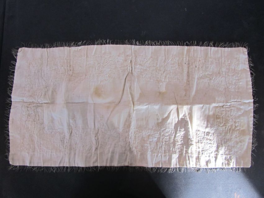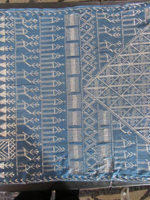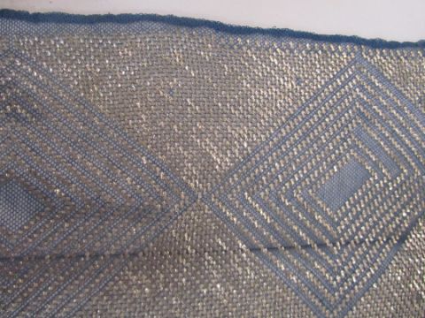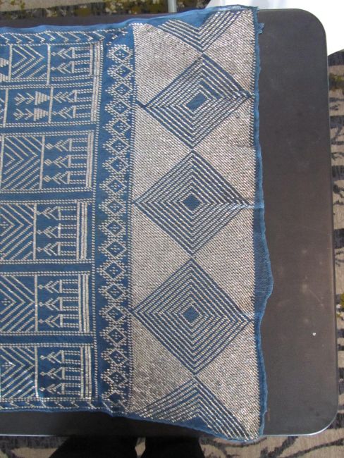 An early 20th century Assuit Egyptian worked silver metal shawl, circa 1920the blue ground worked with silver stylised geometric figures and designs, with diamond shaped motifs to either end; together with a Turkish silver couched and sequinned cream satin cloth, (2)1st: 226 x 72.5cm; 2nd: 81.5 x 42cm approximately.Condition: Fair to good, with wear and staining on the second example; there are rust stains on the cream example front and back; the blue example has slight fraying at the ends and minor silvered metal missing at the ends, sides slightly out of shape at the sides.