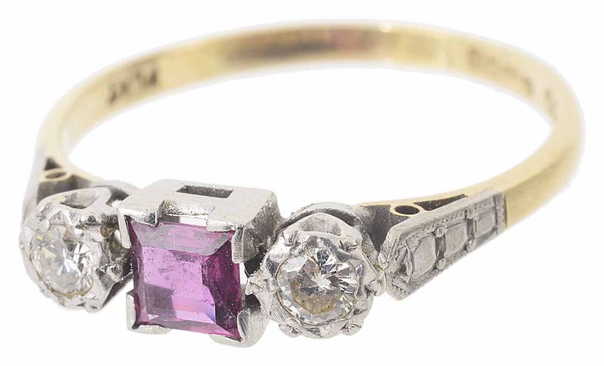 the centre set with square cut ruby set between two brilliant cut diamonds, mount marked for 18ct gold