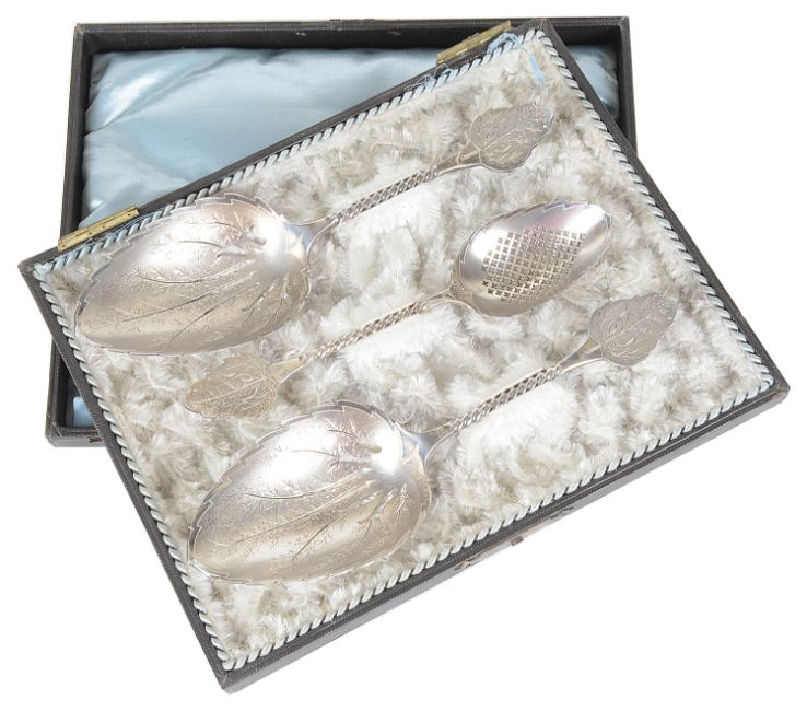 two spoons with pierced leaf decorated bowls with twist handle and a smaller example, fitted case, (3)