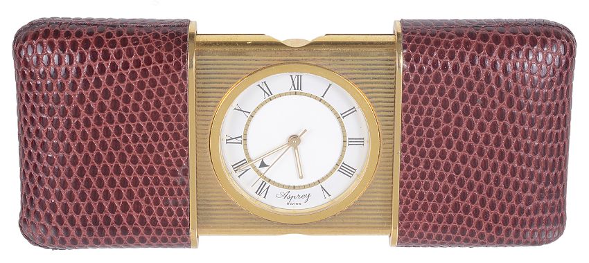 of rectangular form with leather outer case, sliding movement, gilt interior with white dial, Roman hours and baton hands, quartz movement, contained in an Asprey box