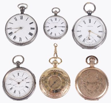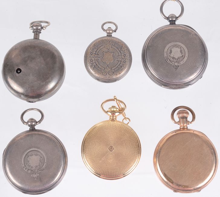 a A.W.W Co Waltham open face pocket watch, the white dial with Roman hours, spade hands and subsidiary seconds, engine turned case with key, hallmarked Birmingham 1904; a Kenola & Denke open face pocket watch, the white dial with Roman hours, spade hands, foliate engraved case, hallmarked 800; a open faced pocket watch chronograph, with white dial, Roman hours, centre seconds, engine turned case, hallmarked London 1882; a Bridgewater open faced verge pocket watch, white dial with Roman hours, with spade hands, in silver case, hallmarked London 1905; a Waltham gold plated full hunter pocket watch, with white dial, Roman hours, spade hands, subsidiary seconds and a Focus gold plated full hunter pocket watch, (6)