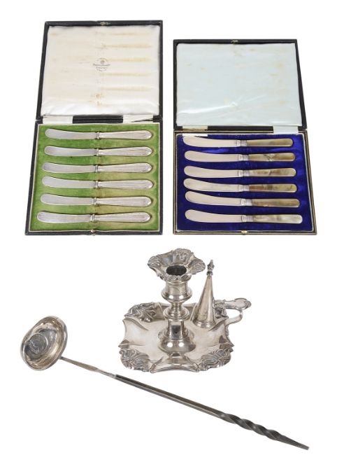 of typical squat form knopped candlestick, matchbox holder and removable snuffer, raised upon a squared base, hallmarked Henry Wilkinson & Co; together with a cased set of six Mappin & Webb Princess plate handled butter knives; a cased set of horn handled butter knives and a horn handled toddy ladle, (qty).