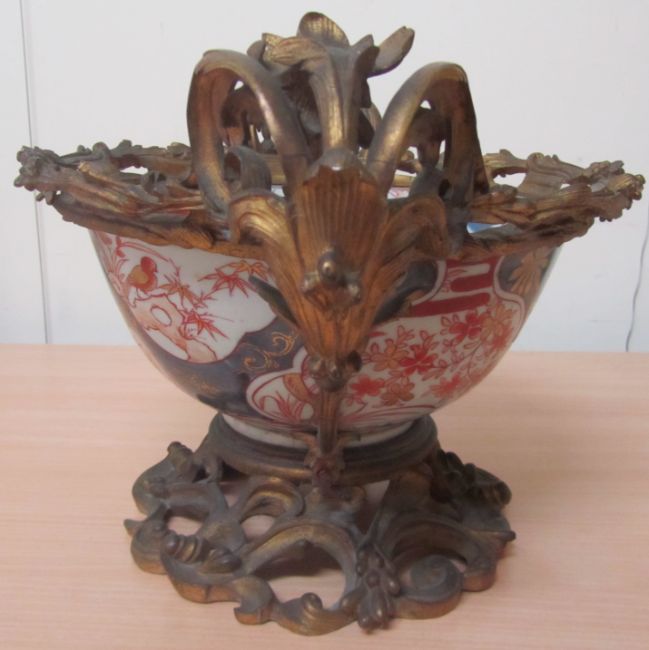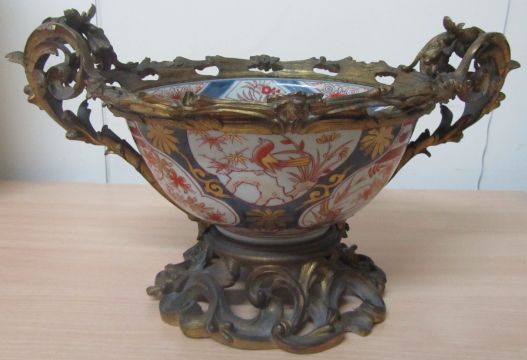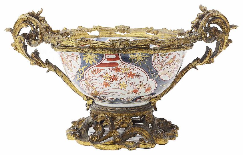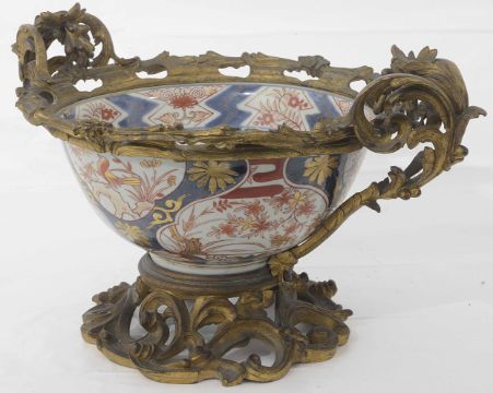 in an ornate ormolu twin mount, the porcelain bowl decorated in the typical palette, the ormolu mount stylised foliate scroll form with twin handles raised upon pierced scroll base, a.f.
