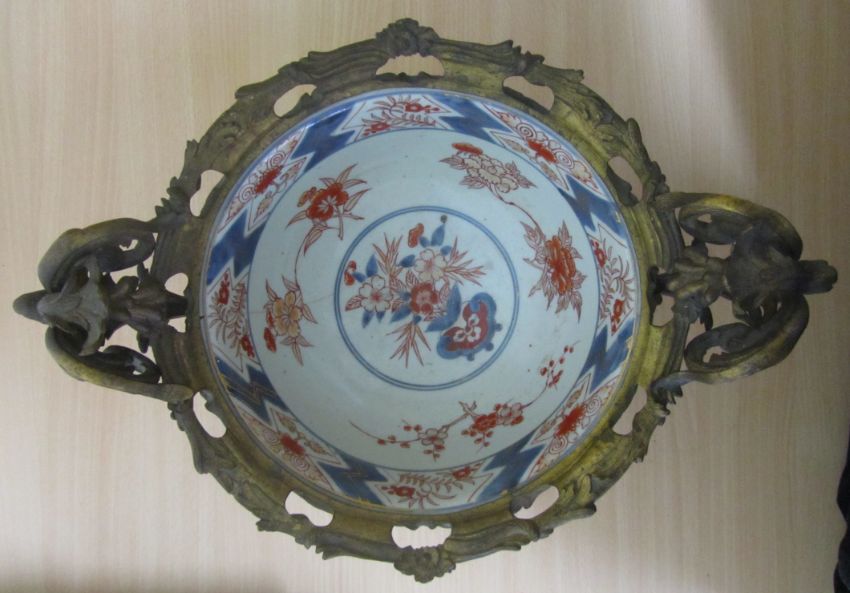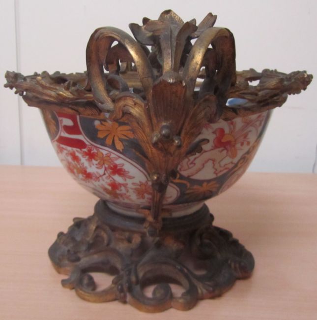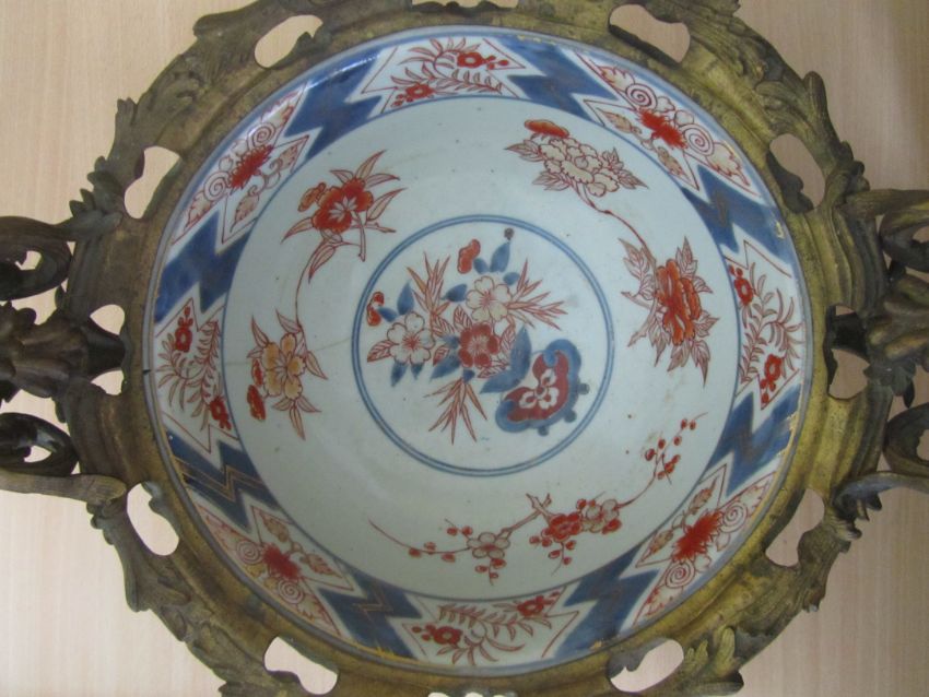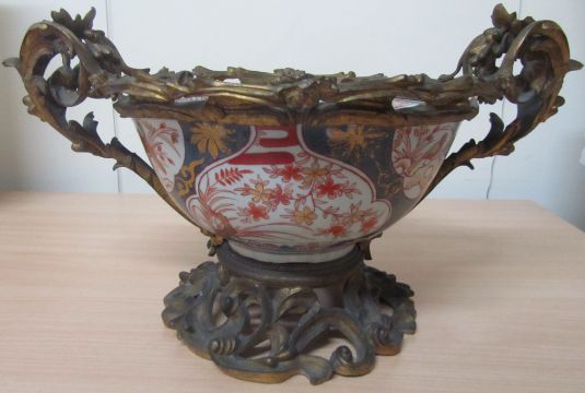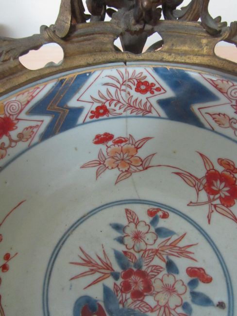 Condition: Fair, with wear throughout, the bowl is cracked from rim into centre, wear to gilt ormolu.