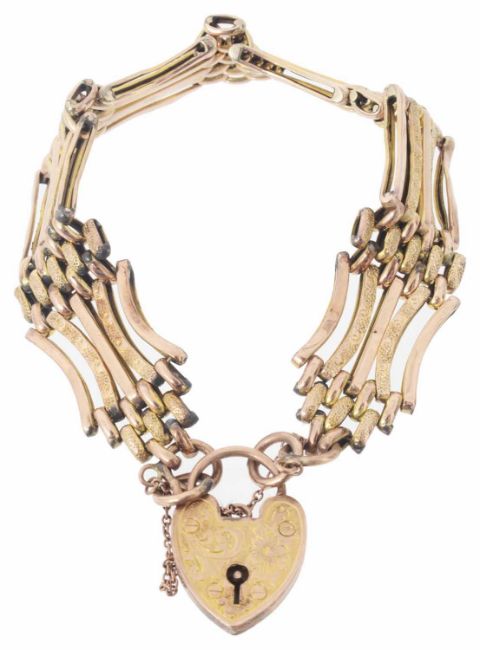 A fancy 9ct rose gold five bar gate bracelet with heart padlock fastening
