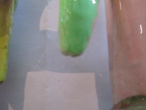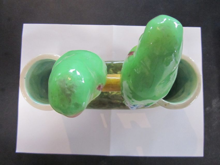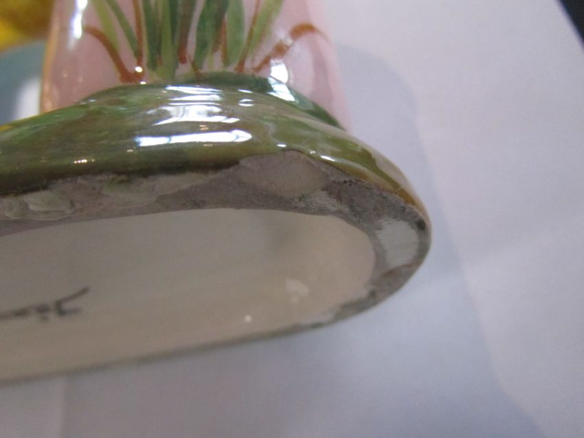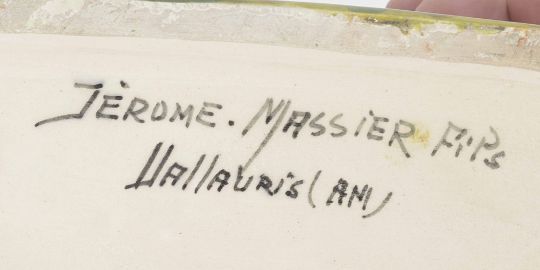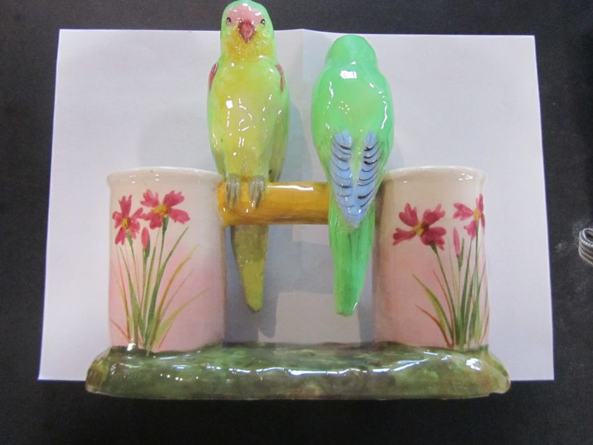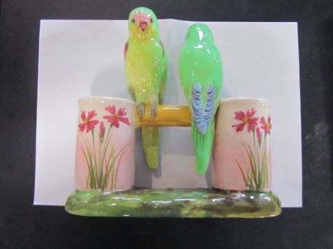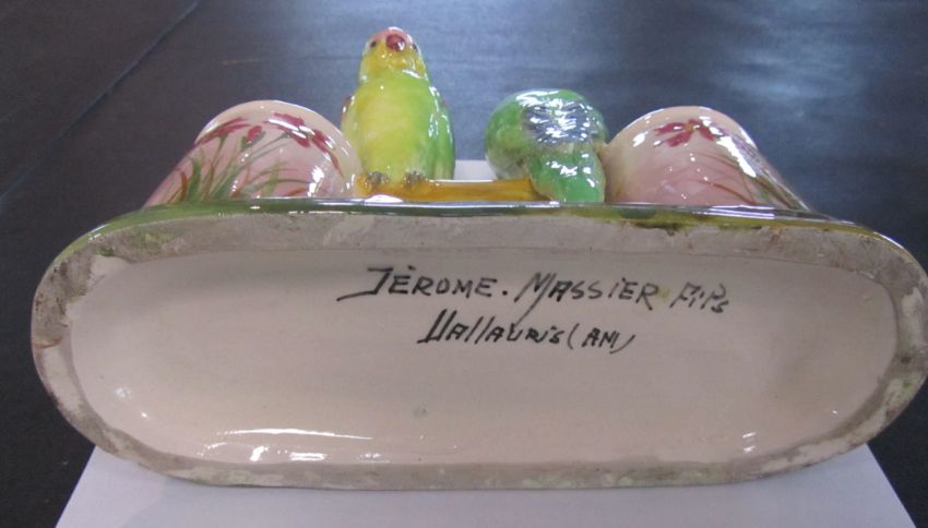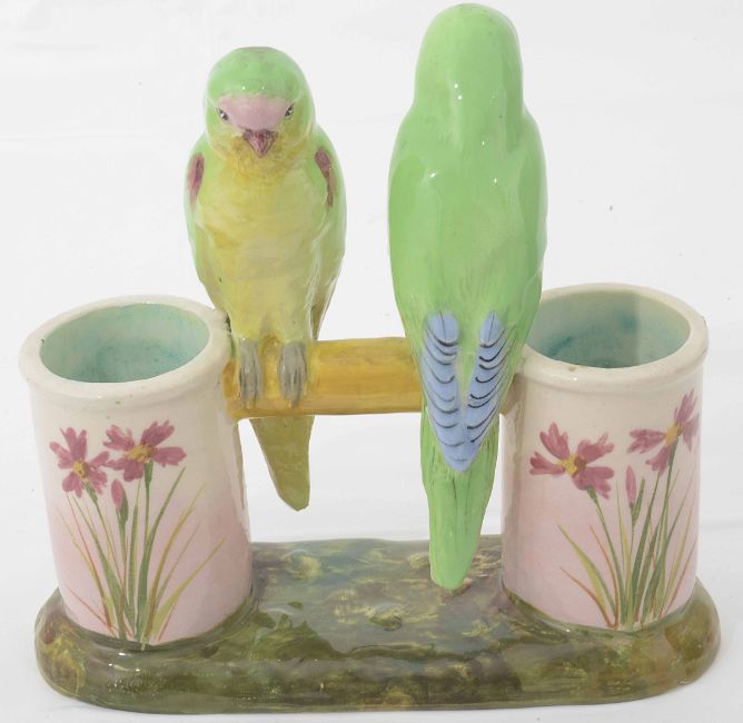 Jerome Massier Fils, A French majolica vase with a pair of budgerigars circa 1910the two hand painted colourful birds perched between two cylindrical vases painted with flower sprays, with painted signature to baseheight 20cm Condition: In good overall condition, with chip to the base edge, there are scratches on the tops of the heads of both birds, there are chips to the ends of both tails.
