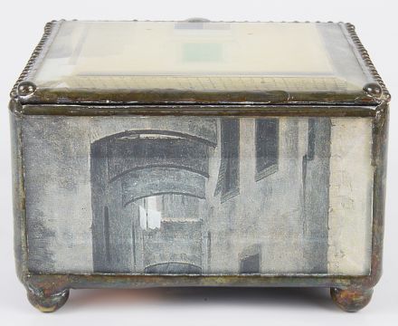 Condition: Fair, with wear to each, the silver plate is worn on the two items, the box has wear to glass and sides.