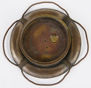the pierced buckle of two parts with scroll design; the square trinket box, with hinged lid, bevelled glass and printed sides and top, upon ball support and a silver plated clock with roman hours, spade hands, in a life raft case, with key, (3)