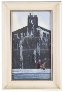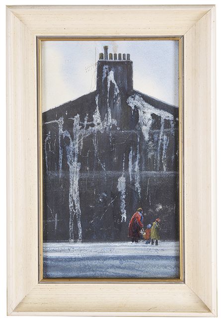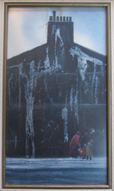 'Figures in front of end of terrace', mother and children on snow covered street, watercolour, ink and body colour on paper, signed lower left, framed
