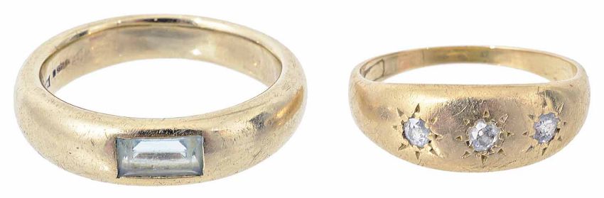 the yellow metal gypsy ring testing for gold, the other set with pale blue gem baguette and marked for 9ct gold (2)