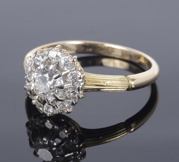 the central diamond approximately 0.40 carats, the cluster set within reed detailed shouldered mount