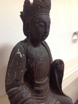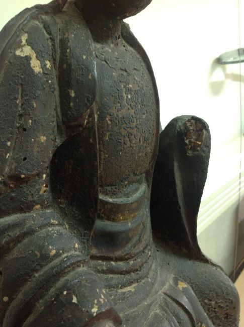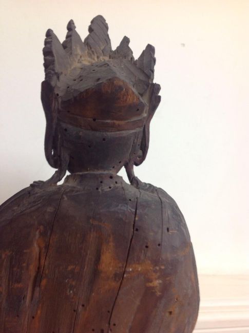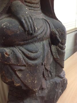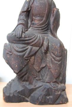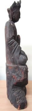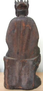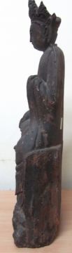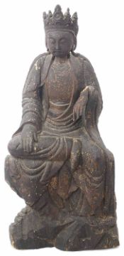 A large Chinese Ming Dynasty lacquered carved wood seated figure of Guan Yin