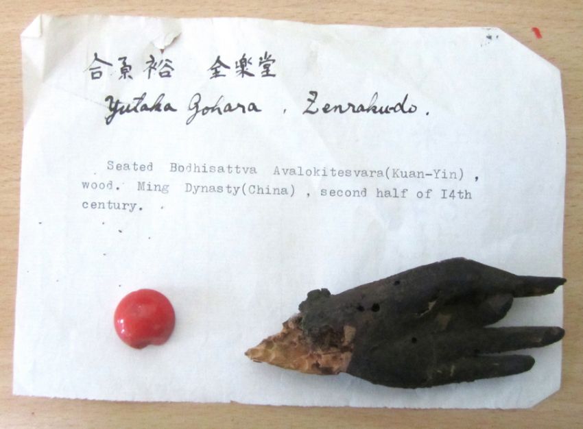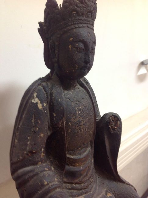 seated upon a rocky base, with draped robes and carved head dress, with original receipt, a.f.