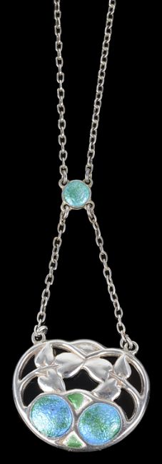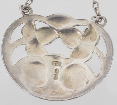 the pierced silver pendant decorated with leaves and enamelled with green and silver and hallmarked Chester and initialled clearly