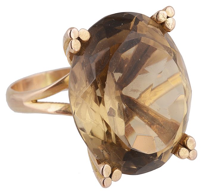 the yellow metal mount testing for gold and having four large three section claws terminating in trefoils securing the stone