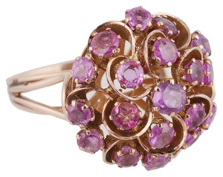 the rose coloured mount testing for gold and of bombe form, set overall with rubies in a swirled floral cluster design