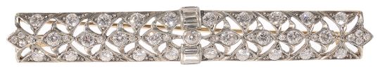 having twenty eight diamonds set across a pierced foliate style trellis mount, diamond detail to ends and baguette diamonds to centre, tests for gold and silver