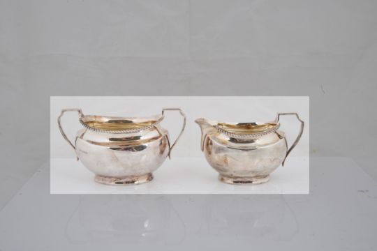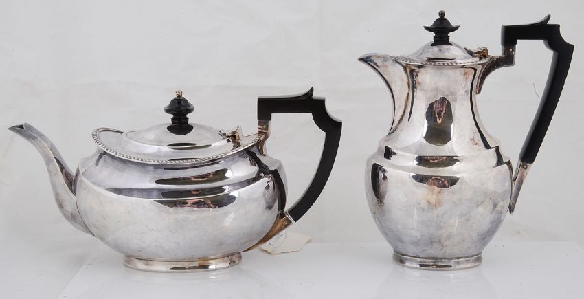 comprising teapot and coffeepot with gadrooned border and ebonised handles and finials, twin handled sugar basin and cream jug, hallmarked Atkin Brothers, (4)