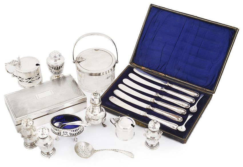 the George V rectangular silver cigarette box, hallmarked Birmingham 1937 by Sanders & Mackenzie; a cased set of six butter knives, hallmarked Sterling; a silver and glass condiment pot with swing handle, hallmarked Birmingham 1927 by Hukin & Heath Ltd; a pierced silver pepperette and mustard with spoon, with blue glass liners, hallmarked London 1926/1927 by C S Harris & Sons Ltd; a pierced silver mustard pot with blue glass liner and spoon, hallmarked Birmingham 1892 by Nathan & Hayes; an Edwardian small silver mustard pot with cover and spoons, hallmarked Chester 1901; four silver pepperettes, hallmarked Birmingham 1899/ London 1959/Birmingham 1920, (11)