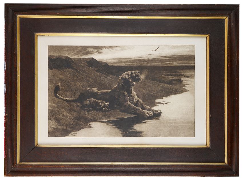 'Lioness with cub at the riverbank', engraving, titled, signed in pencil lower left, mounted and framed