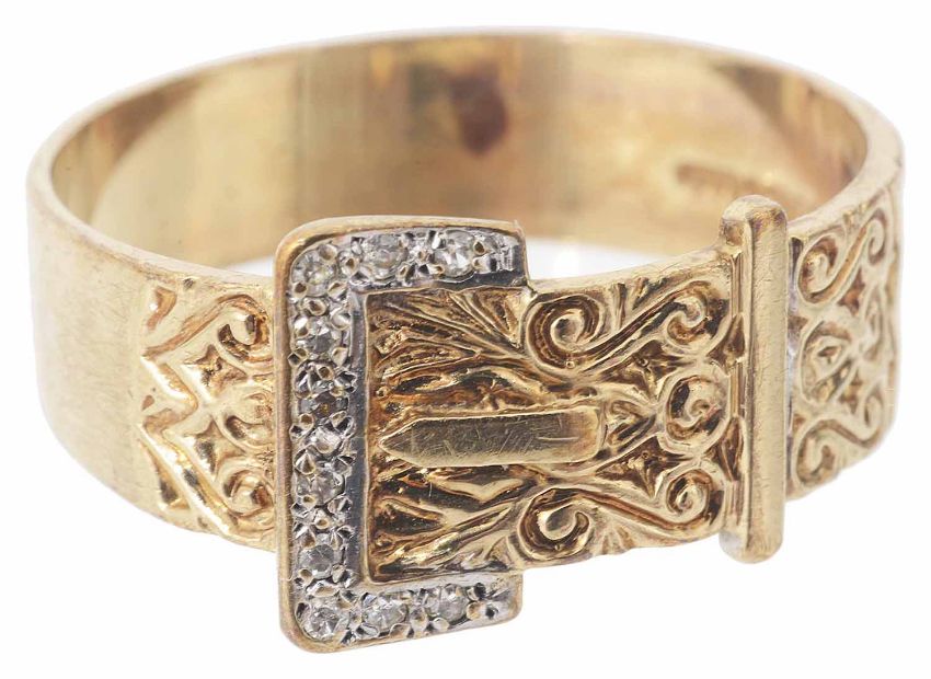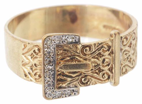the 'belt' with scroll detailing and with diamond set buckle, marked for 9ct gold