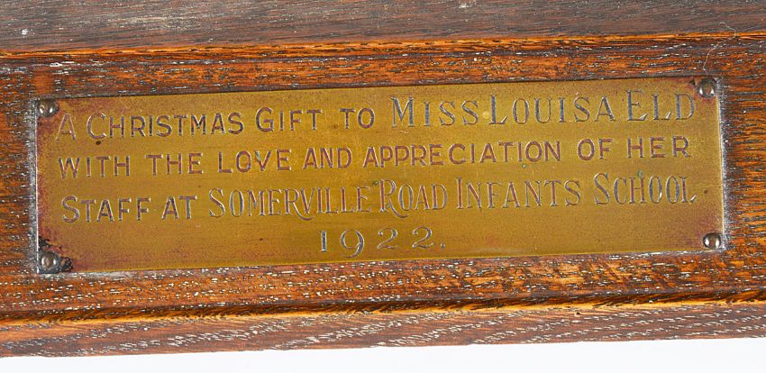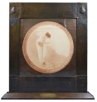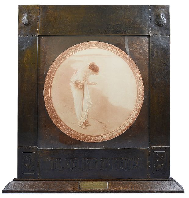 the frame of square form planished with nails and embossed with fish and scallop shells in the corners and embossed "The Sea Hath Its Pearls" in the lower section, surrounding a circular print by William Margetson (British, 1861 - 1940), the frame rests on an oak plinth with engraved plaque "A Christmas Gift to Miss Louisa Eld with the love and appreciation of her staff at Somerville Road Infants School 1922"