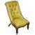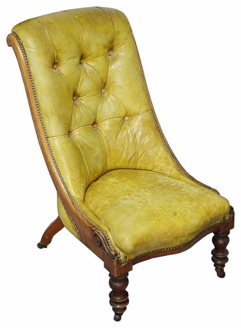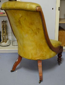 of typical form with button back upholstery with overstuffed seat, raised upon turned front with splayed back supports