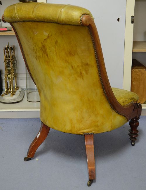 Condition: Fair, with staining to leather upholstery, scratches and dent to the supports and sides, signs of old worm in the mahogany.