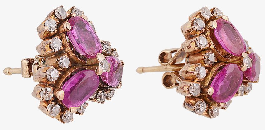 A pair of attractive Continental ruby and diamond trefoil design cluster earrings