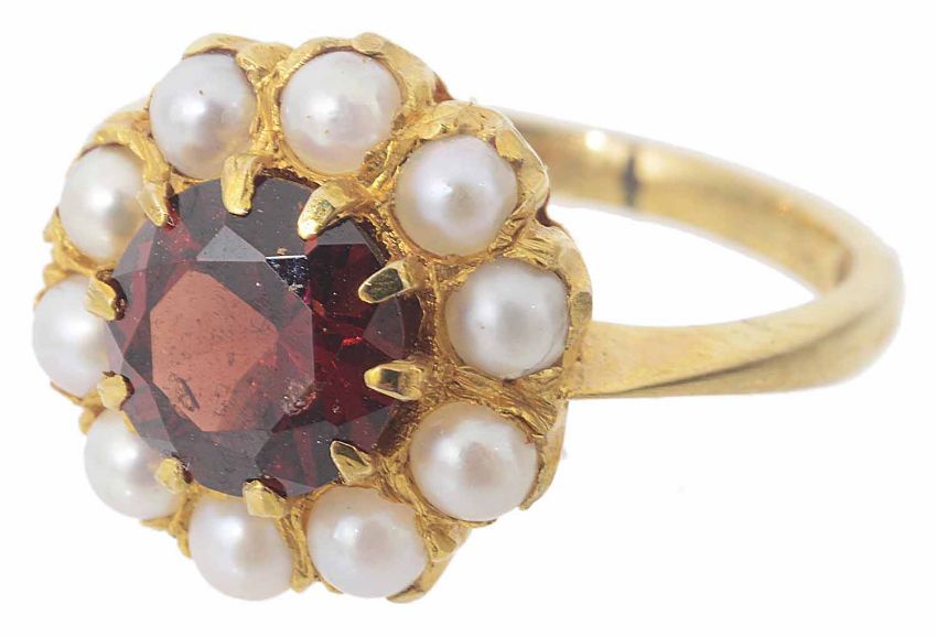 having circular facetted garnet set within a pearl border, mount marked for 9ct gold, associated ivorine ring box