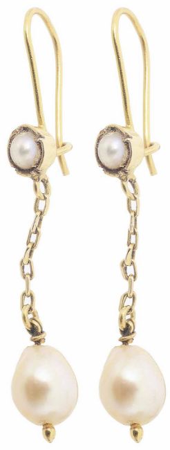(untested) the yellow metal mounts set with half pearls above chains and pendant baroque cultured pearl bellow, mounts test for gold