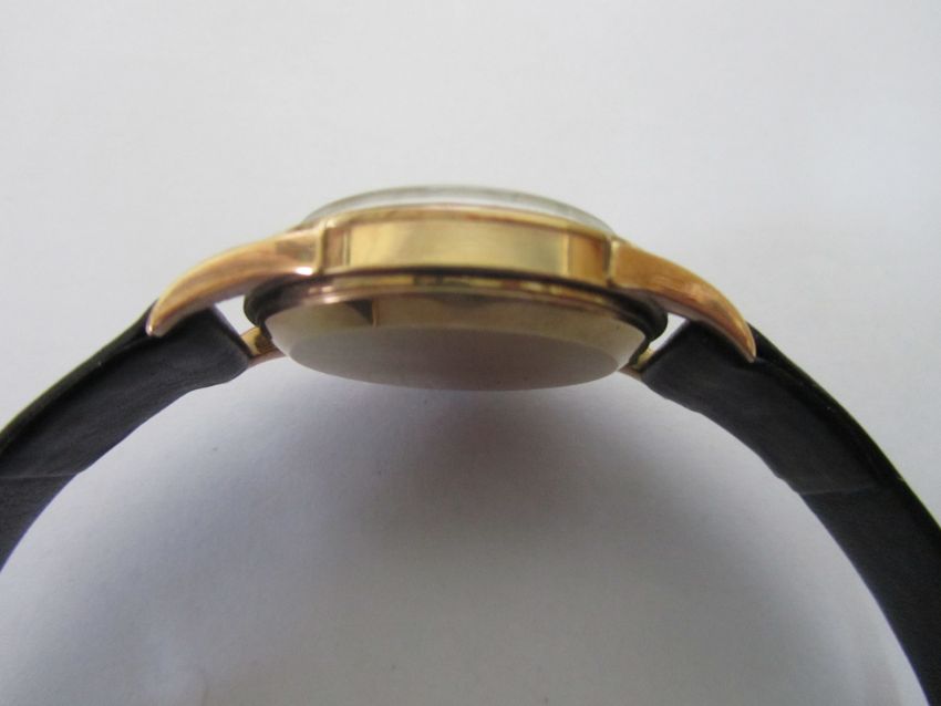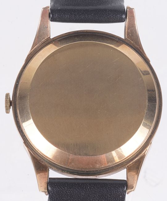 the dial with Arabic quarter hours, dauphine hands, in a circular case, self winding movement, black strap, case back numbered 11809, movement numbered: 43627, logo on crown and dial and movement