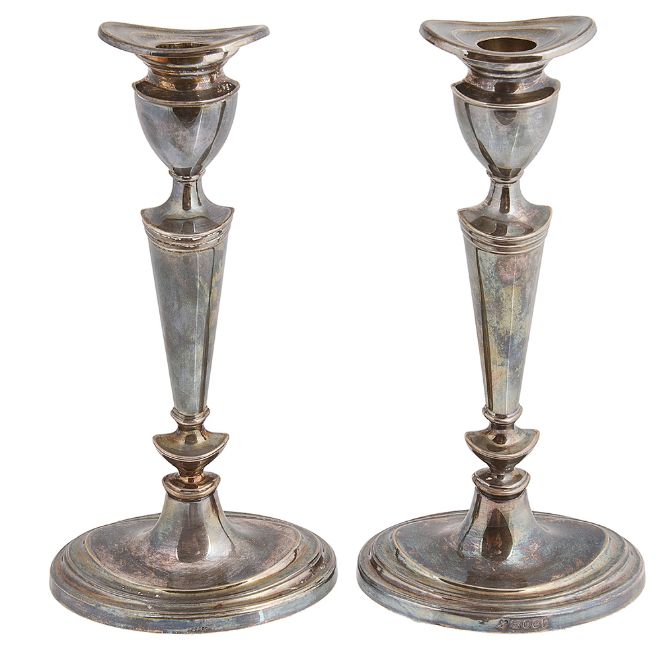 Condition: Fair to good, with minor wear, tarnished, candlesticks loaded