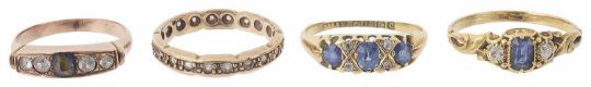 having a central rectangular sapphire between two small old cut diamonds to either side, the scroll mount testing for gold, together with a Victorian three stone sapphire 18ct gold mounted gypsy ring with diamond point detail, a rose coloured metal mounted sapphire and paste ring, tests for gold and a 9ct gold mounted white sapphire set full eternity ring (4)