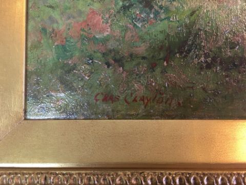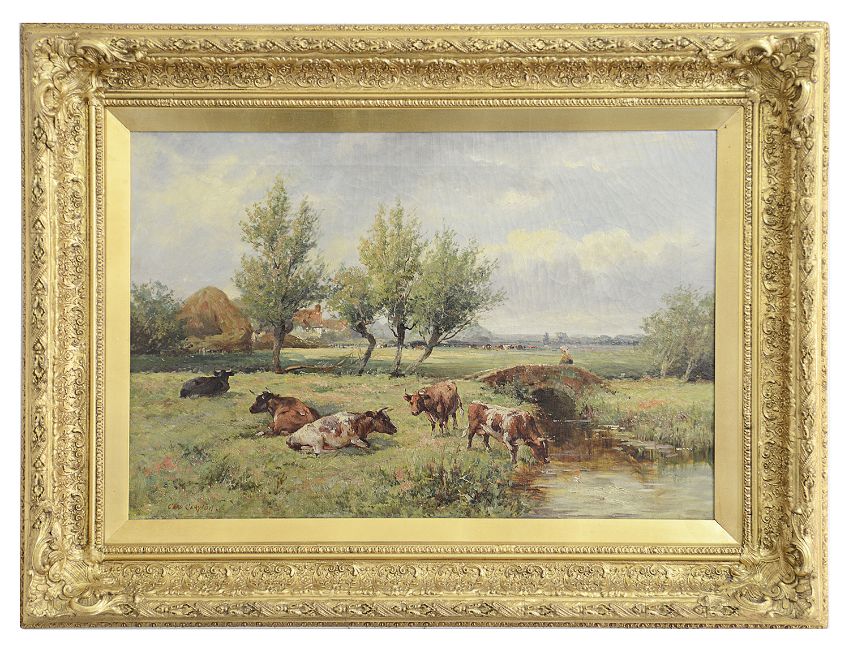 'Highland cattle near a stream', with farm buildings in the background, oil on canvas, signed in red Chas Clayton lower left, mounted in a gilt wooden frame